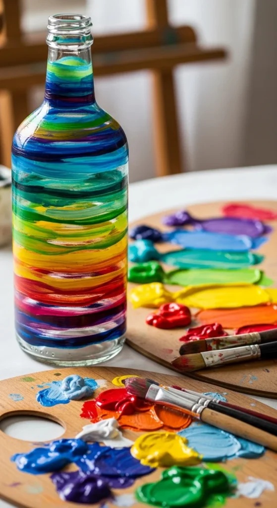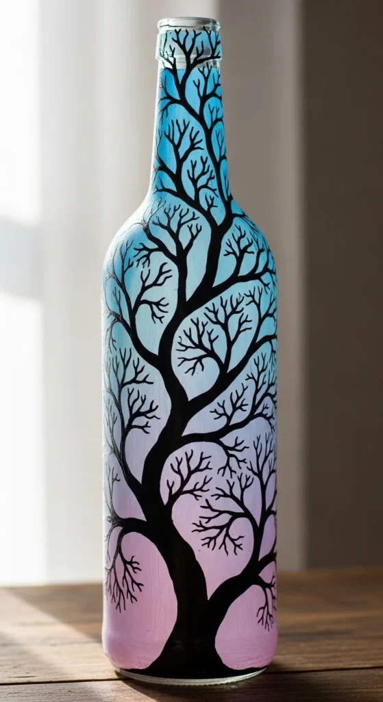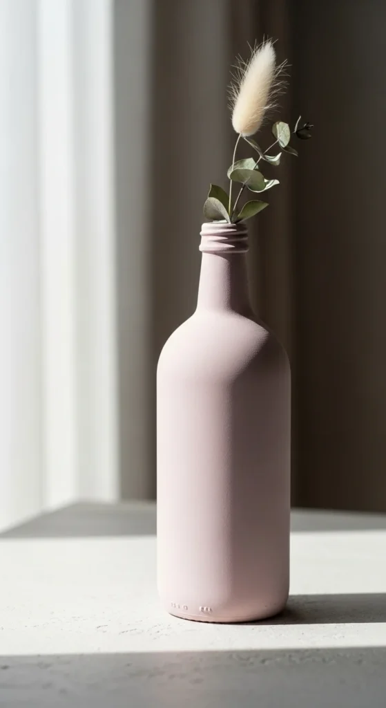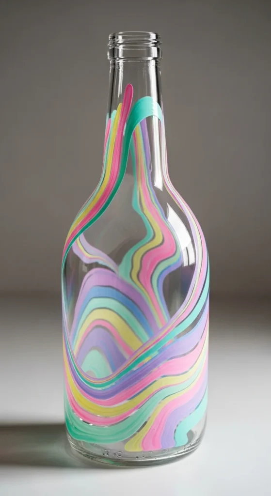 Ombre bottle painting creates a soft gradient color effect that feels modern and stylish. Start with a darker shade at the bottom and blend into a lighter tone toward the top. A sponge works well to create smooth transitions between colors. These bottles look elegant as minimalist vases.