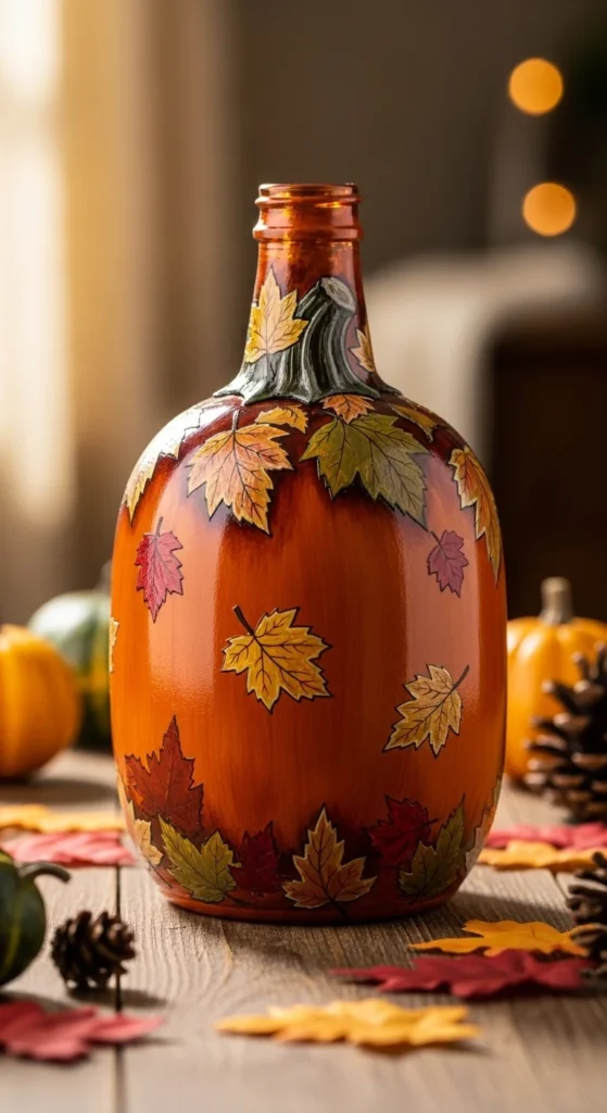 Seasonal bottle painting is a fun way to decorate for holidays. A simple orange-painted bottle with leaf details looks like a cute pumpkin. These crafts are perfect for autumn or Halloween decorations. Place them on tables or porches for festive charm.