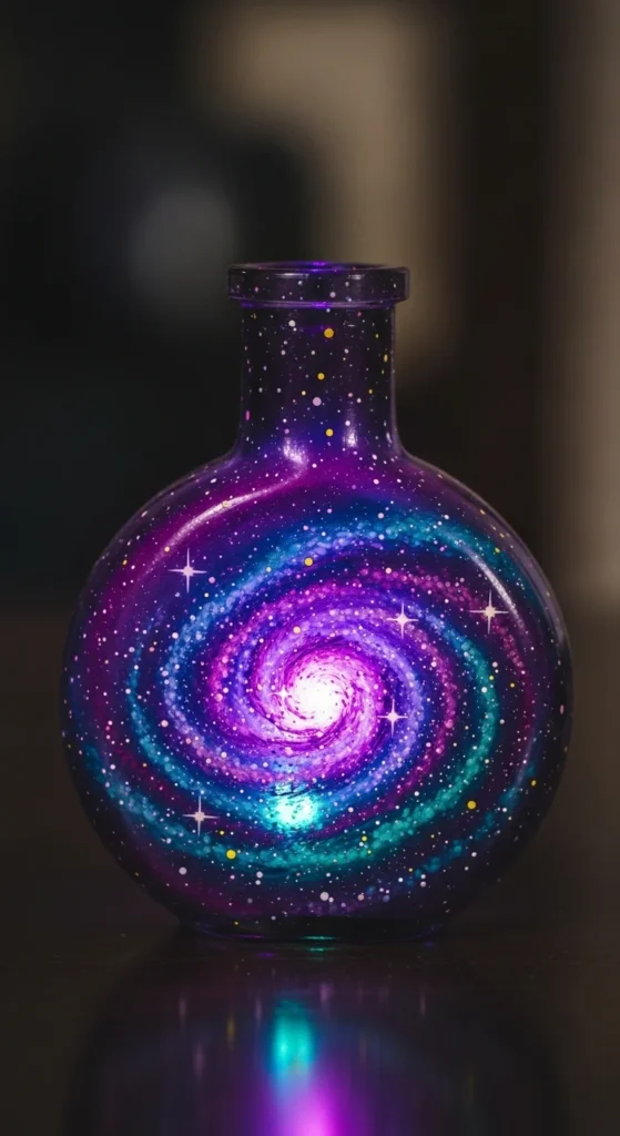 Galaxy bottle painting creates a dreamy cosmic design. Blend dark blues, purples, and blacks to form a night sky background. Then add small white dots for stars and constellations. This design looks magical when placed near soft lighting.