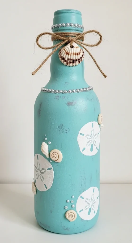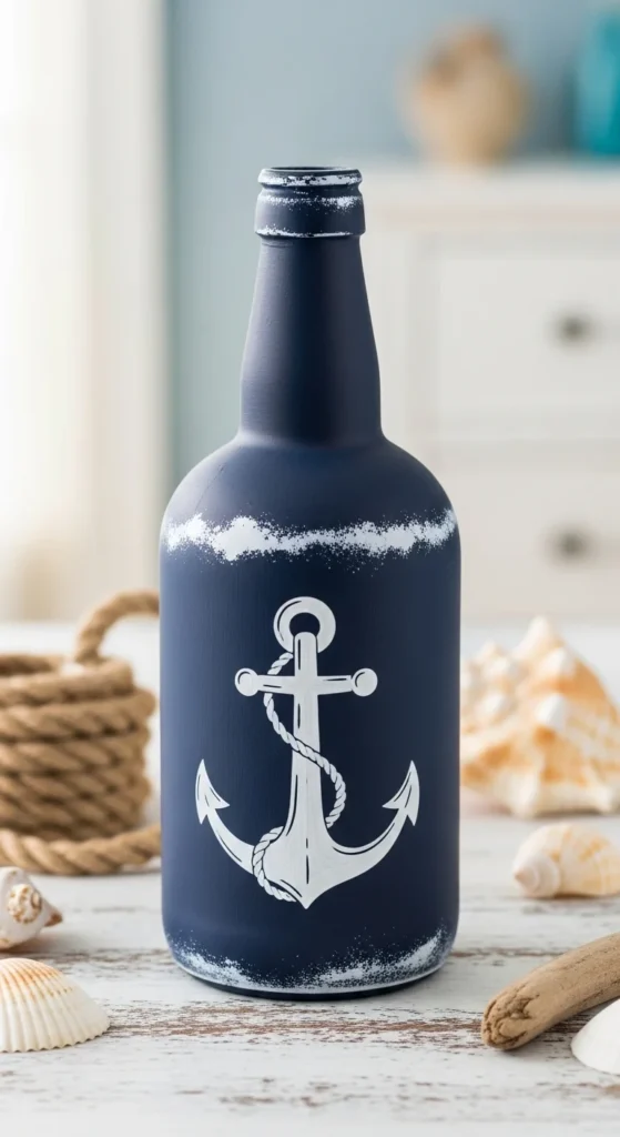 Nautical bottle painting brings a seaside vibe into your home. Paint the bottle in ocean blue shades and add simple anchor or wave designs. Rope wrapped around the neck adds extra texture and charm. These bottles look great in beach-style interiors.