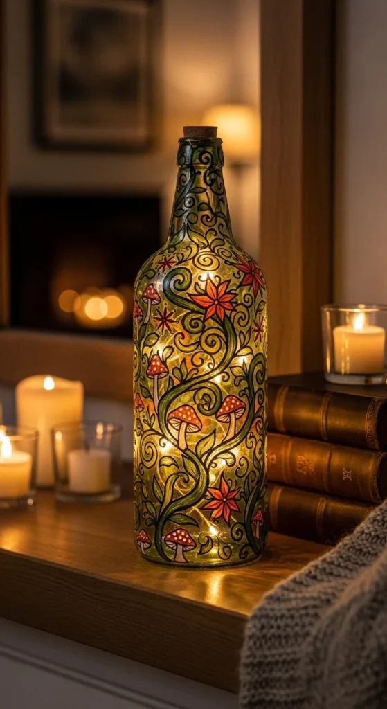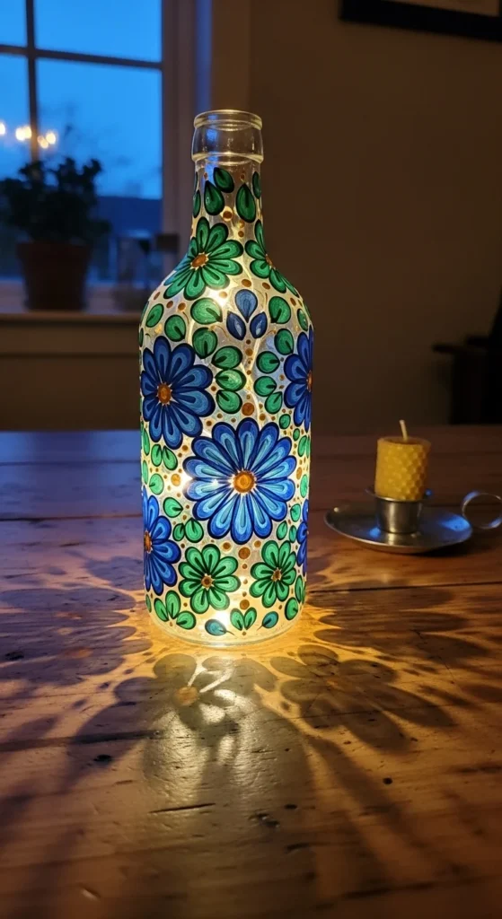 Adding LED lights transforms bottles into functional decor like lanterns or table lamps. The glow highlights the painted patterns beautifully. Perfect for cozy corners, bedrooms, or party setups. LED bottles are both decorative and practical.