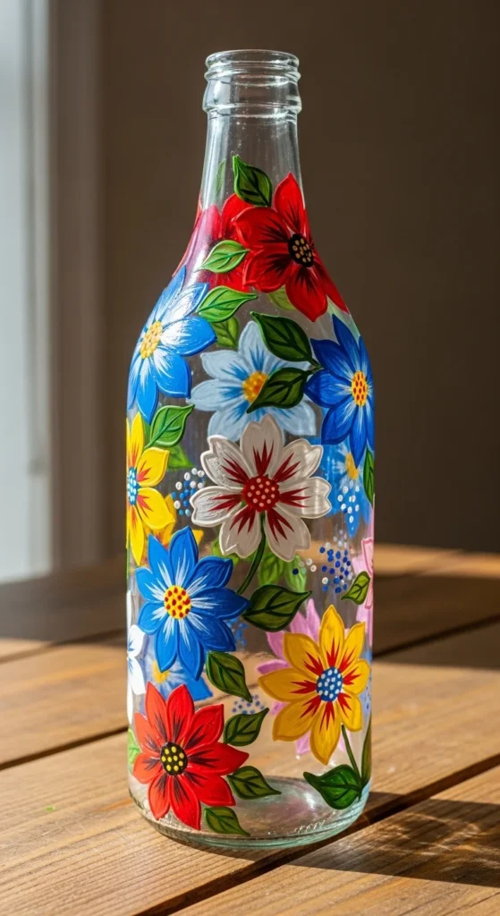 Floral bottle painting is one of the most loved DIY bottle art styles. Delicate flowers painted with acrylic colors instantly transform a plain bottle into a decorative vase. You can choose roses, daisies, or simple wildflower patterns. This design looks beautiful on dining tables, shelves, or window corners.