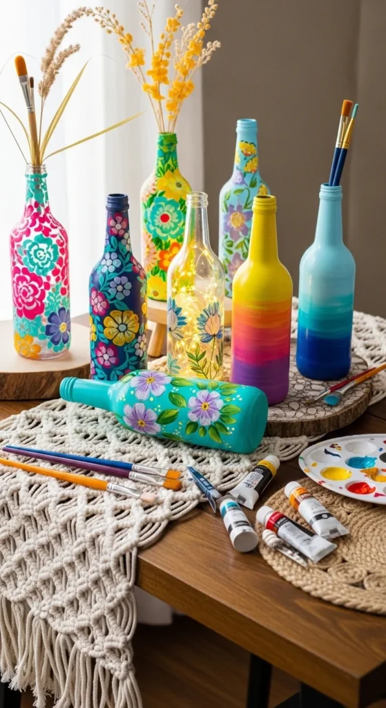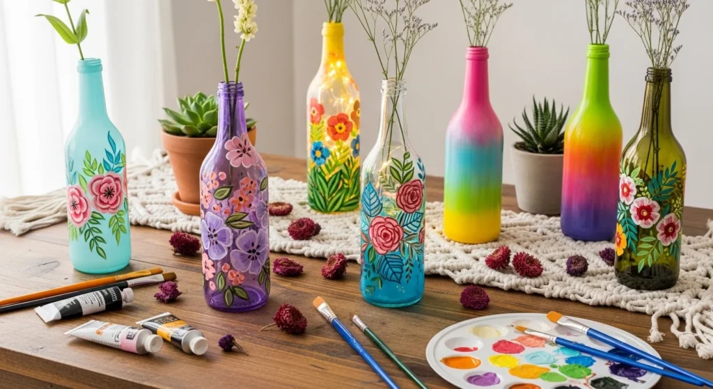 Glass bottle painting is one of the most popular DIY trends for creative home decor. Instead of throwing away old wine or soda bottles, you can easily turn them into beautiful decorative pieces. With simple materials like acrylic paint and brushes, even beginners can create stunning designs. From floral patterns to glowing fairy light lanterns, these painted bottles add charm and personality to any space.