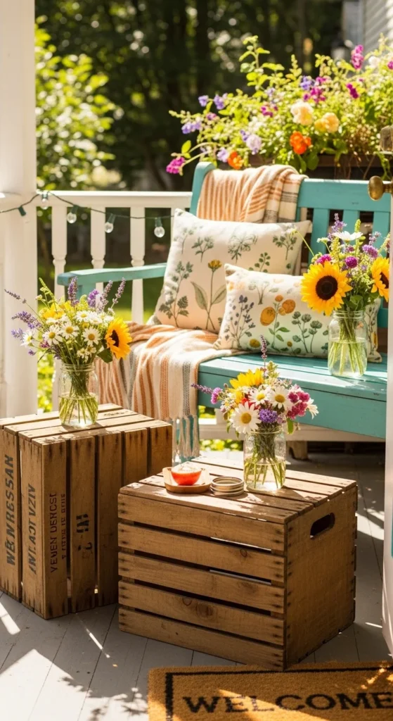 - Pallet or crate furniture: Stack for tables, shelves, or plant stands