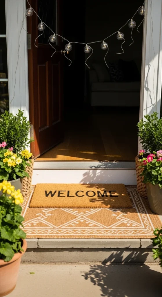- Doormats + outdoor rugs: Start with a patterned rug and add a smaller welcome mat on top