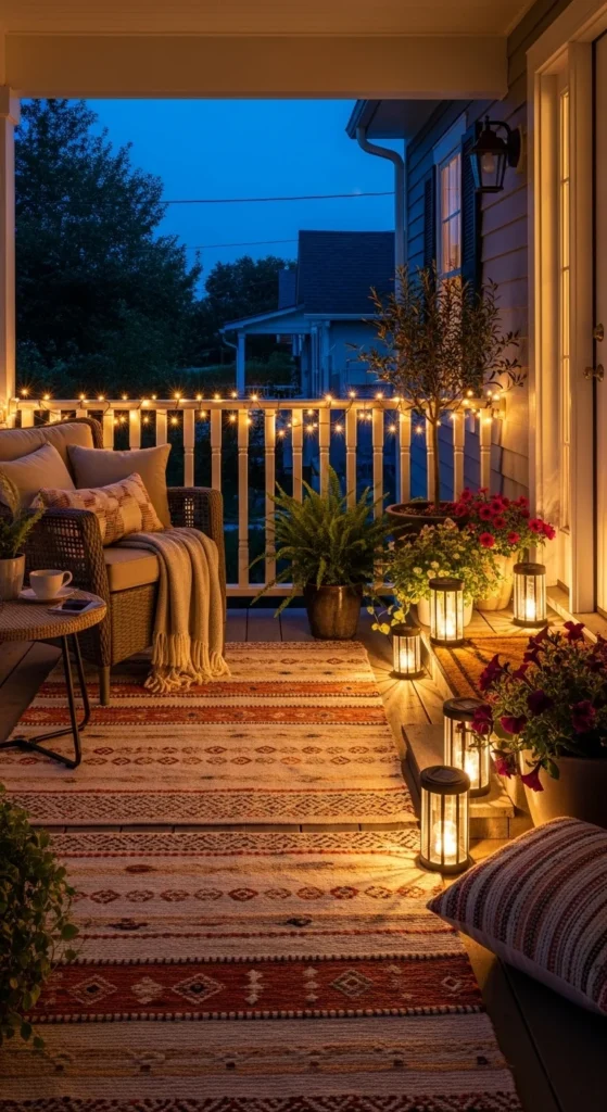- Lighting: Solar string lights, fairy lights, or café lights to add warmth