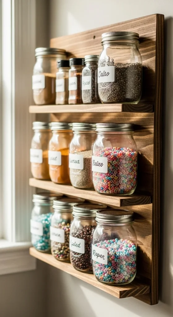3. Mason Jar Wall Grid for Kitchen or Craft Supplies