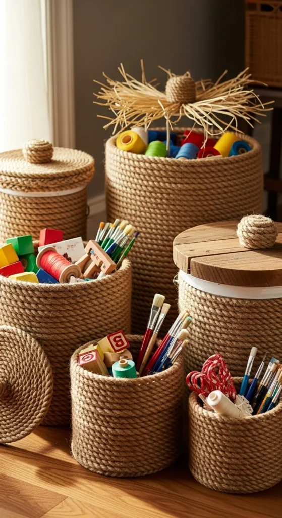 5. Rope-Wrapped Baskets from Paint Buckets