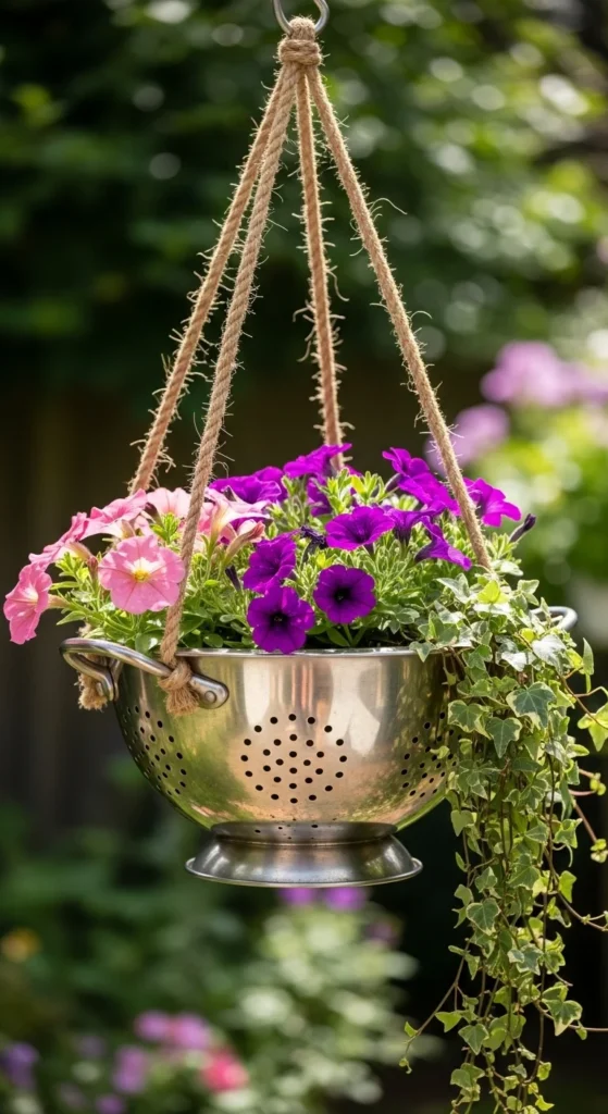 Colanders make excellent hanging planters due to built-in holes.