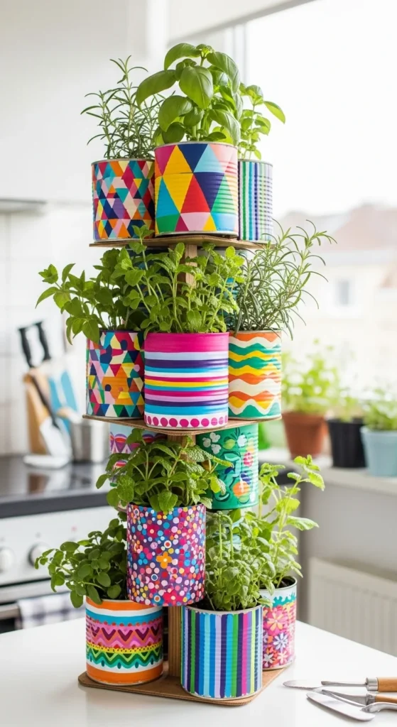 Tin cans are perfect for stackable herb gardens.