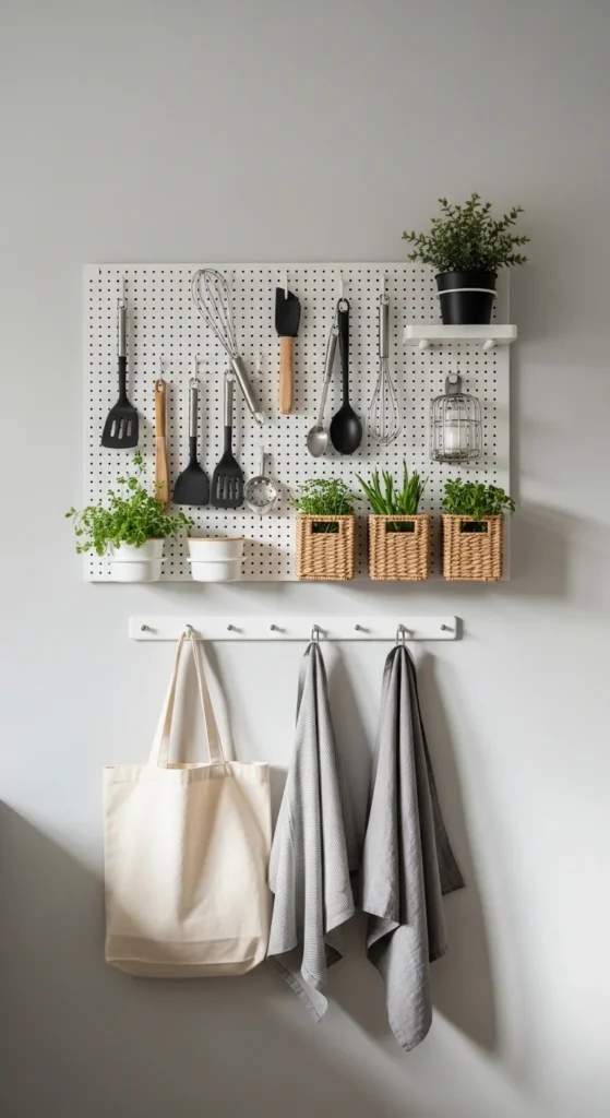 Install hooks for towels, bags, and tools. Add a Pegboard to customize storage for kitchens, jewelry, or craft supplies.