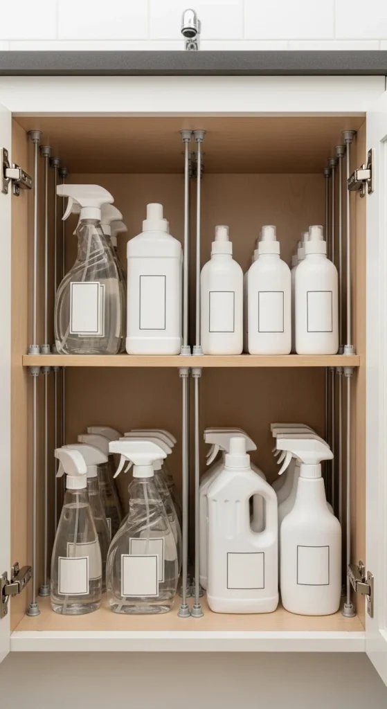 Tension rods aren’t just for curtains. They create shelf sections inside cabinets without tools or drilling.
