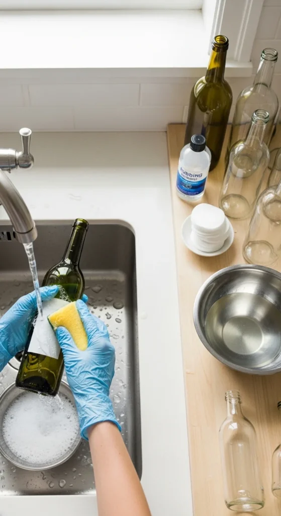 Start by removing labels and adhesive residue. Soaking the bottle in warm water helps loosen the paper, while rubbing alcohol removes remaining glue and fingerprints.