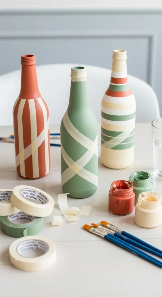 Masking tape is one of the easiest ways to create clean patterns on curved bottles without using stencils.