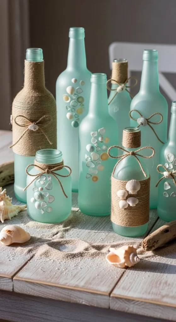 Pair frosted bottles with twine, shells, or neutral colors to create a beach-inspired decorative piece.