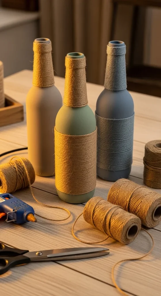 A popular trick is wrapping the bottle neck with jute twine or rope after painting. This adds a rustic farmhouse touch and pairs beautifully with matte paint finishes.