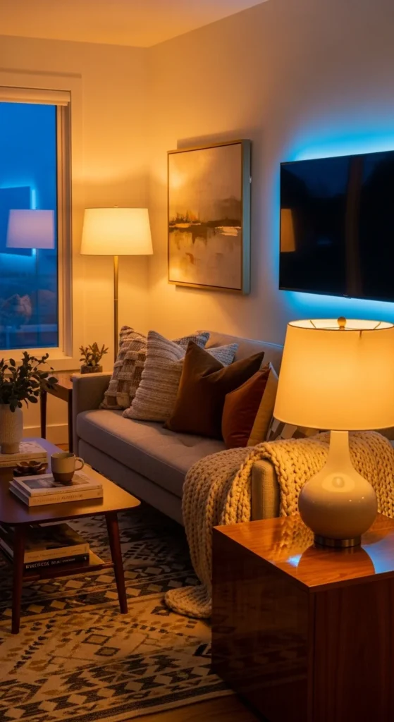 - Warm LED strip behind TV or shelf